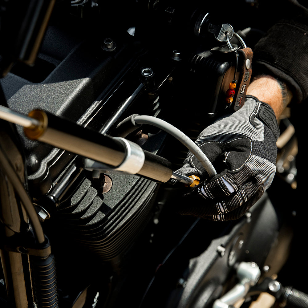 Anyone who has ridden dirt bikes or BMX will appreciate our Moto gloves. Like so many other garage builders and bikeriders, we love the thin palms and snug fit of modern mechanic’s gloves, but can do without their NASCAR-approved colors and graphics. For pure understatement, Biltwell Moto gloves deliver