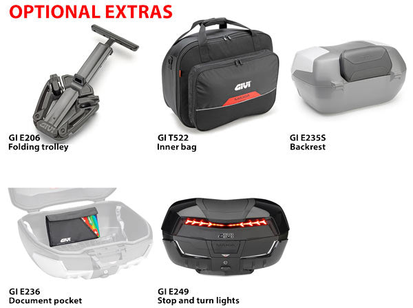 The new V58 is the fifth generation of Givi’s Monokey Maxia top cases. With a massive 58 litre capacity, this is one of the roomiest top cases on the market, but with clean, aerodynamic lines and low weight, it feels and looks incredibly streamlined. Ideal for touring, the V58 can easily hold two helmets. The V58NNT version is black with a transparent reflector and four covers painted with a glossy black finish.