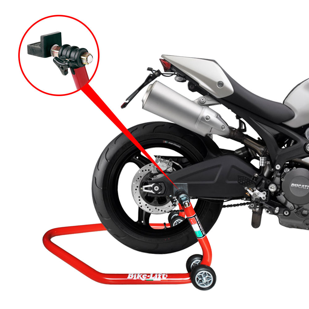 Universal rear stand designed with double wheels to insure maximum stability of the bike on the ground.  Comes with either rubber cursers, V cursers, or both sets of cursers. 34cm high.
