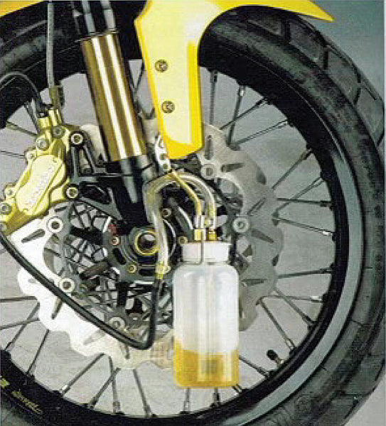 The collection reservior eliminates annoying spills when changing the hydraulic fluid by using the brake or clutch lever to pump it out. It incorporates a check valve to prevent air from entering the system. This handy unit can be attached directly to the bike and has a built-in filter.