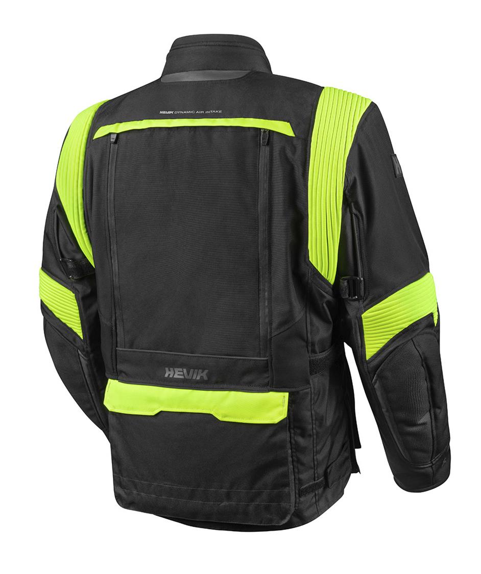 2 adjustable air vents on the forearms, adjustable at the waist and wrists thanks to the adaptable hook and loop fastenings and with four waterproof pockets plus one “Napoleon” pocket, a rear pocket for an approved back guard, double adjustment on the sleeves, with a dynamic adjustment system and the option for attachment to the trousers with a zip.