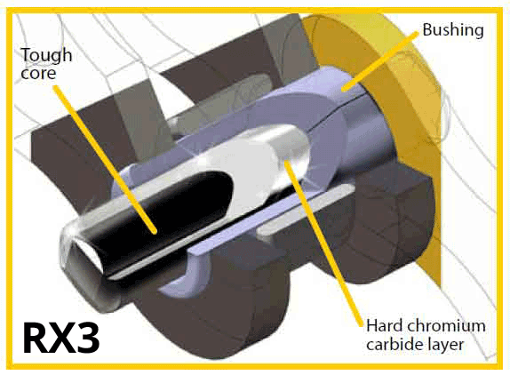 RX3 chain also features Chromized Pins for an exceptional pin surface hardness to maximise wear resistance as well as enhanced pin core strength to guarantee outstanding shock resistance.
